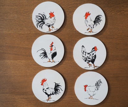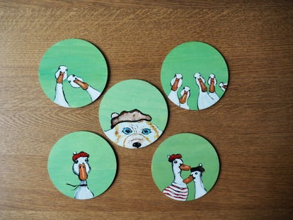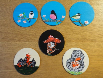Unieke onderzetters met in acryl geschilderd pluimvee. Op houten dragers. Rond 10 cm.