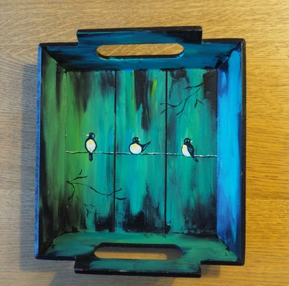 Decoratief dienblad beschilderd met acrylverf. Afgewerkt met vernis. Afm. 20 x 20 cm.