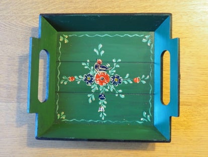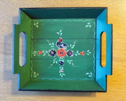 Decoratief houten dienblad in Hindelooper groen. Beschilderd met acrylverf en afgewerkt met vernis. Afm.20 x20 cm.