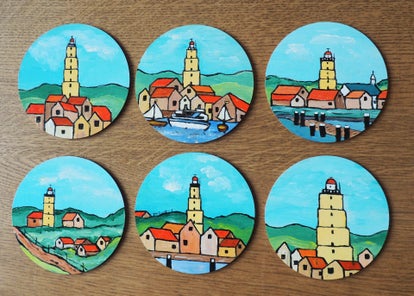 Handbeschilderde onderzetters. Gebruikt materiaal:acrylverf op hout. Afgewerkt met lak dus eenvoudig te reinigen.Rond 10 cm. Per set van zes of los verkrijgbaar. VERKOCHT.