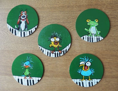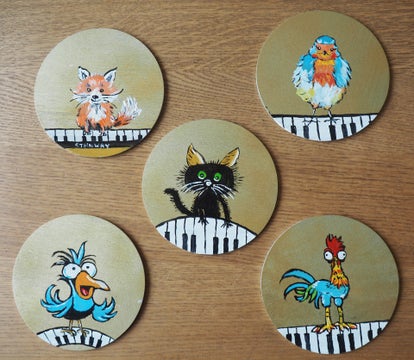 Onderzetters met diermotief. Uniek want nergens anders verkrijgbaar. Geschilderd met acryl op hout. Afgewerkt met lak. 10 cm. Prijs is per stuk.