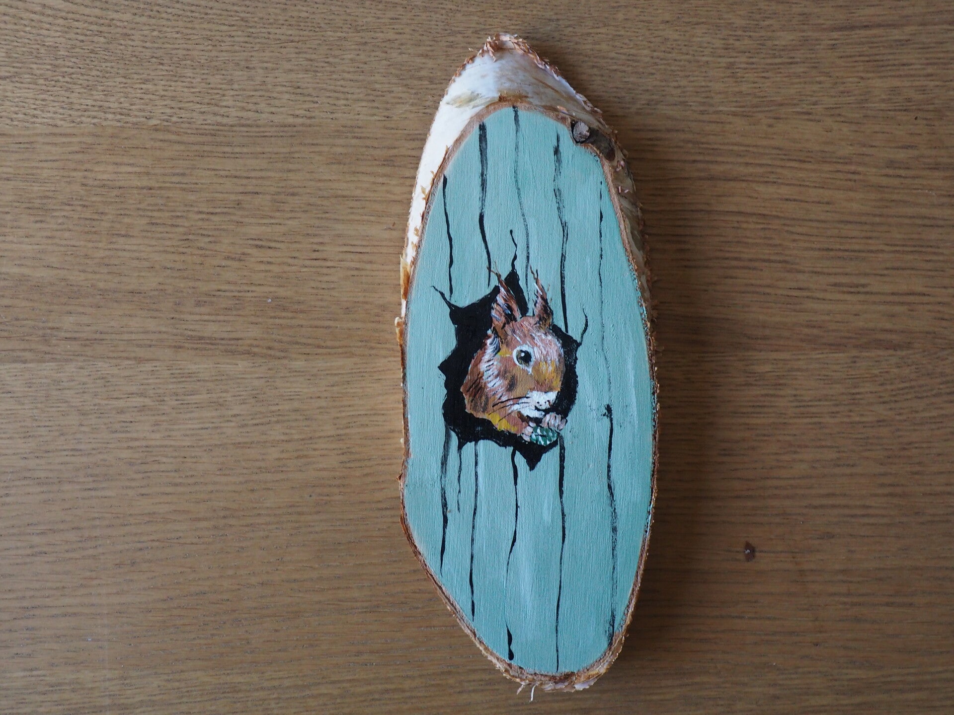 Geschilderd met acryl op hout. Afgewerkt met vernis en voorzien van hanger. Afm.20 x 10 cm.