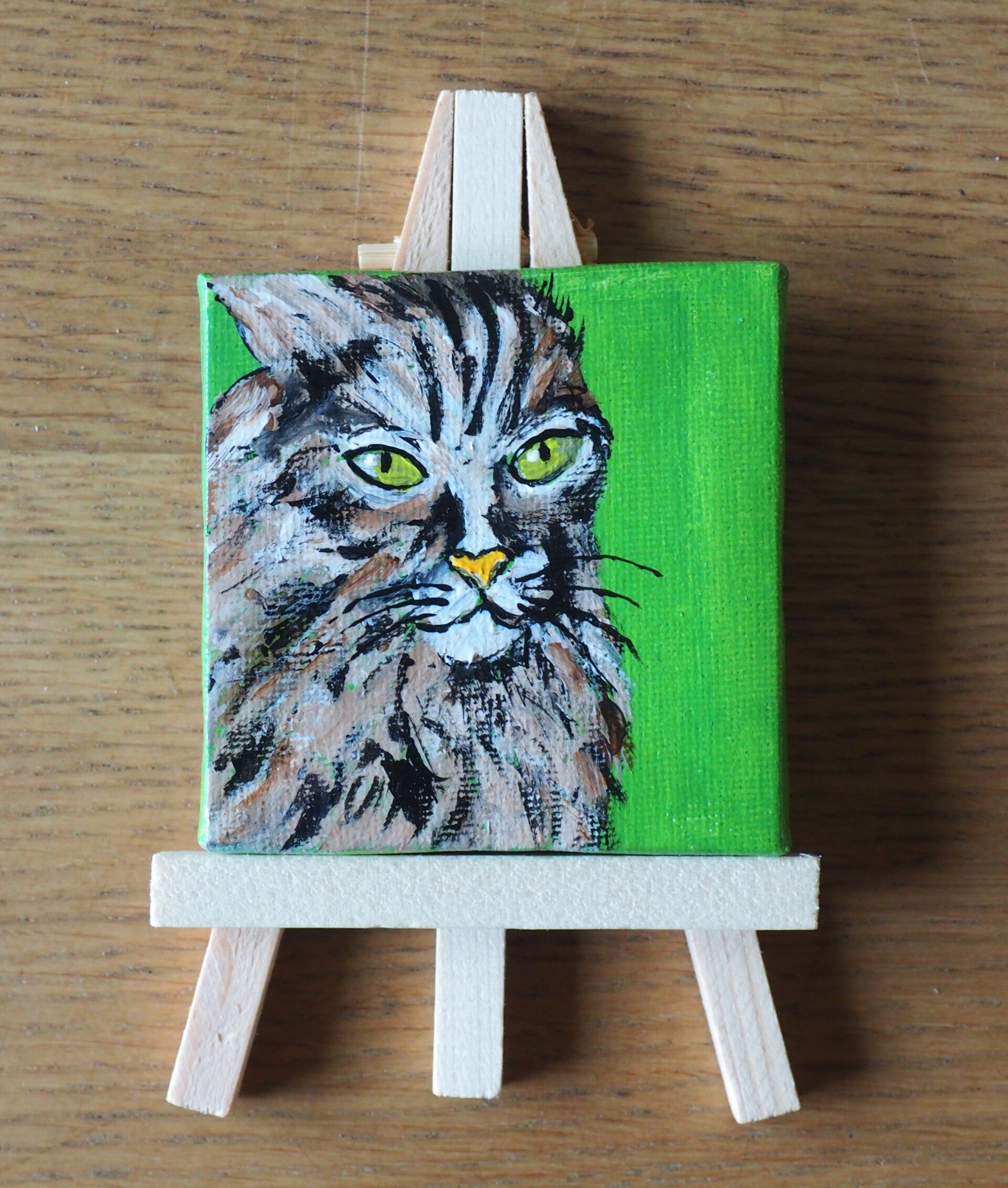 Minischilderij van kat in acrylverf op canvas. Afgewerkt met vernis. Afm. 7 x 7 cm. De prijs is incl. schildersezel.