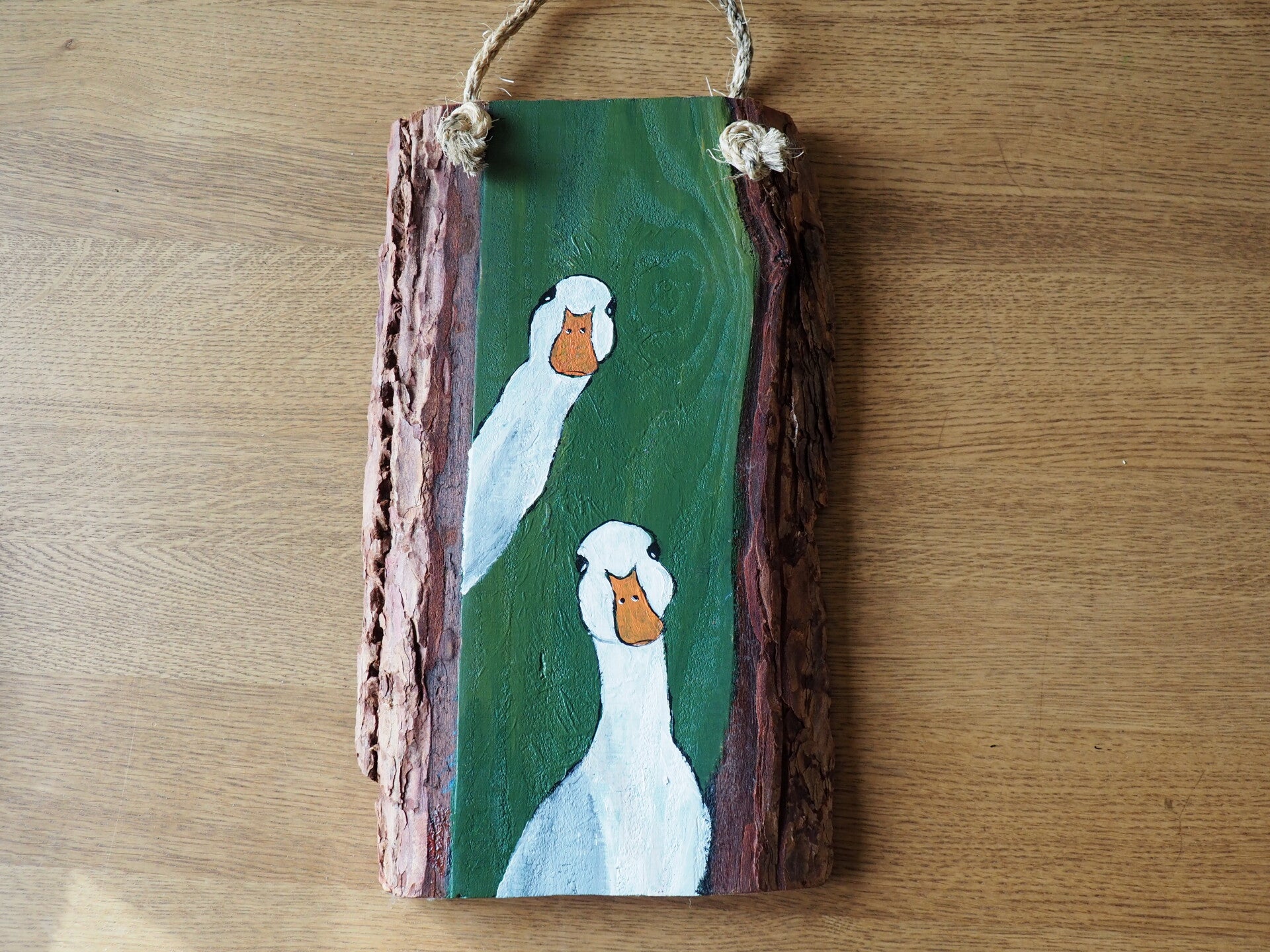 Met acrylverf op hout geschilderd en afgewerkt met vernis. Afm. 35 x 22 cm. Voorzien van op hangtouw. Geschikt voor binnen en buiten.